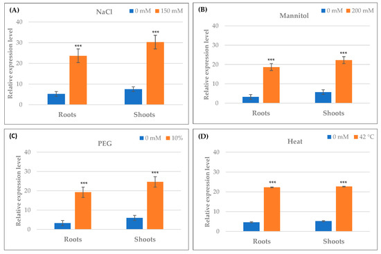 qRT–PCR expression analysis of TdPR1.2 gene under different abiotic stresses, (A) salt, (B) mannitol, (C) PEG 10%, and (D) heat. (***) indicates value significantly different from the control. Statistical significance was assessed by applying the Student t-test at p < 0.01.