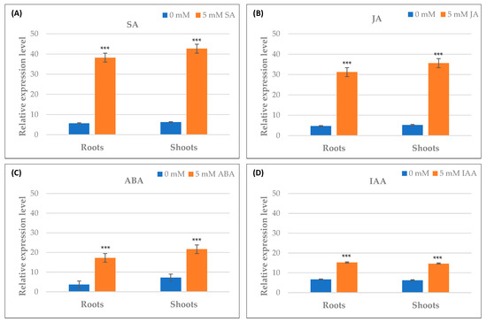 qRT–PCR expression analysis of TdPR1.2 gene under different hormonal stresses, (A) salicylic acid (SA), (B) jasmonic acid (JA), (C) abscisic acid (ABA), and (D) IAA. (***) indicates value significantly different from the control. Statistical significance was assessed by applying the Student t-test at p < 0.01.