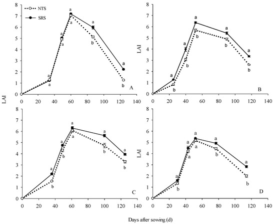 The maize leaf area index (LAI) under two cropping systems by different management practices in 2015 and 2016. NTS: no-till with single row planting. SRS: strip deep rotary combined with staggered planting. Values are mean ± SE (n = 3). Different lower-case letters adjacent to the error bars denote significant pairwise differences between means for a given date after sowing (p < 0.05; Duncan test). (A): LAI of spring maize in 2015; (B): LAI of summer maize in 2016; (C): LAI of spring maize in 2016; (D): LAI of summer maize in 2015.