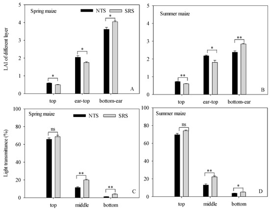 The LAI distribution of the canopy, from top to bottom, was as follows (Figure 2A,B): Compared with the NTS, the LAI from bottom to ear significantly increased by 11.85% (in spring maize) and 19.54% (in summer maize) under the SRS treatment. However, the SRS significantly reduced the LAI from ear to top by 14.54% and 16.83% in spring and summer maize, respectively. At the top layer, the LAI was SRS < NTS.