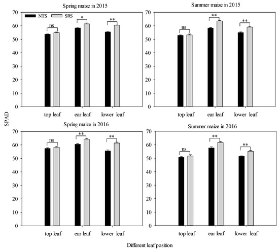 The values of SPAD at different leaf layers under two cropping systems in response to different treatments in 2015 and 2016. NTS: no-till with single row planting; SRS: strip deep rotary with staggered planting. Values are mean ± SE (n = 3). * indicates significance at p < 0.05, ** indicates significance at p < 0.01. ns indicates no significance, p > 0.05.