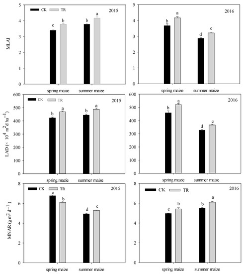 In summer maize, a higher MLAI and LAD were found under the SRS treatment, with increasing values of 9.90–11.87% in 2015 and 2016. Over the two years, the MNAR was SRS > NTS, and the increases in SRS were 7.06% and 10.96%, respectively.