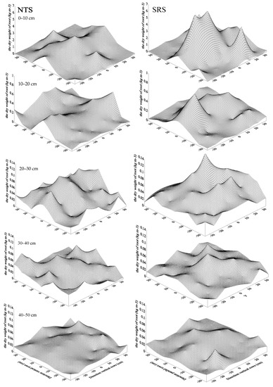 The dry weight of the roots decreased significantly with the increase in soil depth (Figure 6). The root dry weight density in the soil layer at 0–50 cm was 0.13 kg m–3 for the NTS and 0.19 kg m–3 for the SRS. Compared to the NTS, the root dry weight was increased by 33.26% (0–10 cm), 6.92% (10–20 cm), 30.82% (20–30 cm), −16.84% (30–40 cm), and 1.81% (40–50 cm).