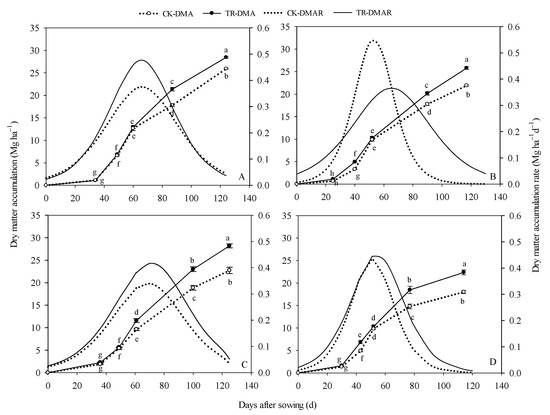 The dry matter accumulation (DMA) and dry matter accumulation rate (DMAR) of maize in response to different treatments in 2015 and 2016. (A): spring maize in 2015; (B): summer maize in 2015; (C): spring maize in 2016; (D): dry matter accumulation of summer maize in 2016. Values are mean ± SE (n = 3). Different lower-case letters adjacent to the error bars denote significant pairwise differences between means for a given date after sowing (p < 0.05; Duncan).