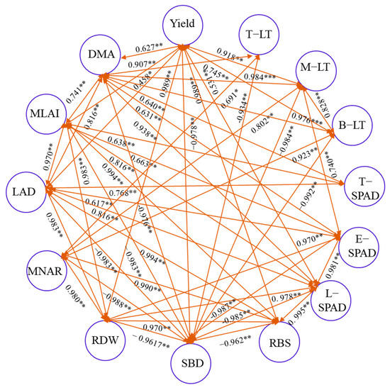 According to the correlation analysis (Figure 8), the yield was positively correlated with the aboveground dry matter accumulation (DMA) (R2 = 0.627 **). In addition, the higher DMA should theoretically benefit the MLAI, LAD, T-LT, M-LT, B-LT, T-SPAD, E-SPAD, L-SPAD, RDW, and RBS. The DMA and SBD displayed an extremely significant negative correlation. The MLAI and LAD were significantly, positively correlated with T-SPAD, E-SPAD, L-SPAD, RDW, and RBS. The root dry weight density and root bleeding sap content had negative correlations with soil bulk density, and the correlation coefficients were −0.962 ** and −0.996 **.