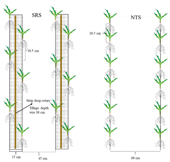 Schematic diagram of planting patterns for different cropping practices. SRS is integrated management practices for canopy–topsoil treatment with strip subsoiling in the tillage layer and small, double-row, staggered planting technology in the canopy layer; NTS is no-tillage with seed planted in a single row.