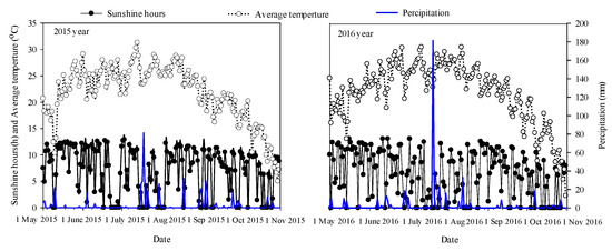 Daily temperature, sunshine hours, and precipitation during the maize growing seasons of 2015 and 2016.