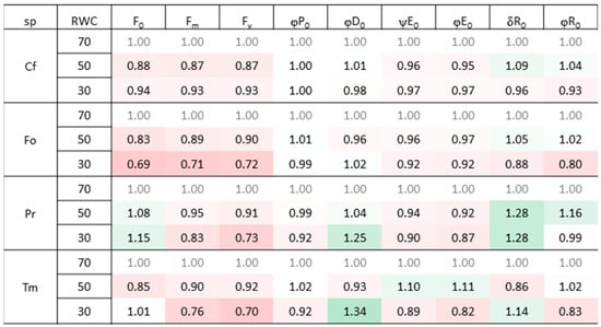 The effect of combined drought and heat on selected parameters describing the light-dependent phase of photosynthesis in investigated plant species. The results are presented as a heatmap, for which mean values were used (n = 5). The red coloring of the cell shows a negative correlation, while the green one shows a positive one. The intensity of the color informs about the strength of the correlation. Abbreviations: Cf—Carex flacca, Fo—Festuca ovina, Pr—Potentilla reptans, Tm—Trifolium medium, RWC—relative water content, F0—minimal fluorescence, Fm—maximal fluorescence, Fv—variable fluorescence, φP0—maximum quantum yield of primary photochemical reactions, φD0—quantum efficiency of energy dissipation, ψE0—values of probability that a trapped exciton moves electron into the electron transport chain beyond QA−, φE0—quantum efficiency of electron transfer from QA– to electron transport chain beyond QA−, δR0—probability that an electron is transferred to reduce end electron acceptors at the PSI acceptor side, φR0—quantum yield for the reduction of terminal electron acceptors on the acceptor side of PSI.