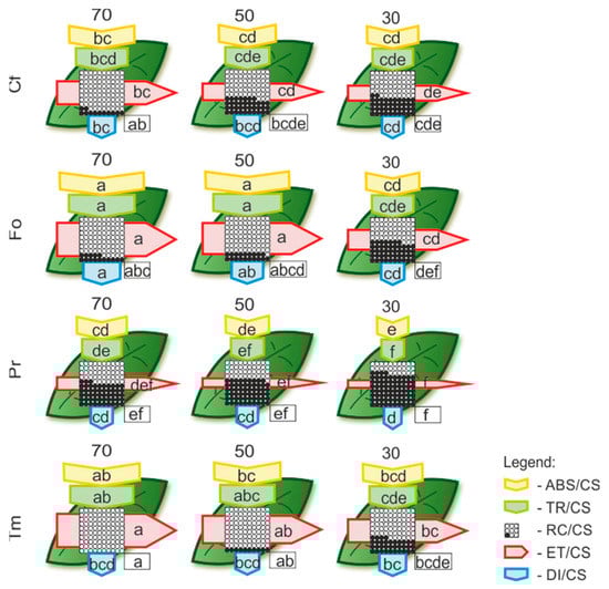 Models of energy flow through the photosystem II (PSII) of excited cross sections (CS) of leaves enable a quantitative and qualitative comparison of the efficiency of the light phase of photosynthesis between the studied species and their response to drought and heat stress (Figure 2). Under the control conditions, the Tm and Fo photosystems showed similar efficiency, while the Pr showed the worst. The analysis using the model confirmed a lack of significant differences in most parameters of Cf under the influence of drought. At the same time, it was shown that the best quantum yield in the conditions of the strongest drought compared to the other species tested was characterized by PSII in Tm (Figure 2).