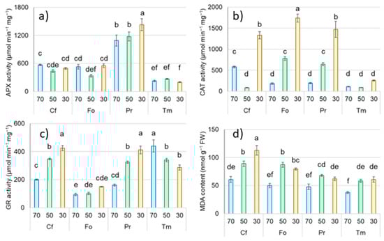 The effect of combined drought and heat on activity of APX (a), CAT (b), and GR (c), and content of MDA (d) in leaves in investigated species of sedge (Cf—Carex flacca), grass (Fo—Festuca ovina), rosaceous (Pr—Potentilla reptans), and clover (Tm—Trifolium medium). Data are means ± SE (n = 3). Means followed by the same letter for each parameter are not significantly different from each other using the Fisher LSD test (p < 0.05). Abbreviations: APX—ascorbate peroxidase activity; CAT—catalase activity; GR—glutathione reductase activity; MDA—malondialdehyde content.