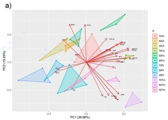 The PCA analysis confirmed that the tested species were characterized by different mechanisms of response to drought stress, because they formed separate groups arranged in a clear gradient consistent with the stress intensity (Figure 4a). Moreover, the correlations between the examined physiological parameters revealed species-specific patterns of response to drought and heat stress (Figure 4b–e).