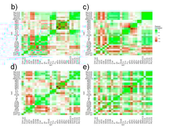 Principal component analysis (a) and heatmaps of correlation between selected parameters for Carex flacca (b), Festuca ovina (c), Potentilla reptans (d), and Trifolium medium (e) under combined drought and heat treatment. Abbreviations: DW (g)—dry weight in grams; Protein—protein content; CAT—catalase; APX—ascorbate peroxidase; GB—glycinebetaine; MDA—maliondialdehyde; ChlA—chloropyll A; ChlB—chlorophyll B; Car—carotenoid; E—transpiration rate; gs—stomatal conductance; A—photosynthesis rate; WUE—water use efficiency; F0—minimal fluorescence; Fm—maximal fluorescence; Fv—variable fluorescence; φP0—maximum quantum yield of primary photochemical reactions; φD0—quantum efficiency of energy dissipation; ψE0—values of probability that a trapped exciton moves an electron into the electron transport chain beyond QA−; φE0—quantum efficiency of electron transfer from QA– to electron transport chain beyond QA−; δR0—probability that an electron is transferred to reduce end electron acceptors at the PSI acceptor side; φR0—quantum yield for the reduction of terminal electron acceptors on the acceptor side of PSI; ABS/CS—absorption flux per CS (leaf cross section), approximated; DI/CS—dissipated energy flux per CS; TR/CS—trapped energy flux per CS; ET/CS—electron transport flux per CS; RC/CS—number of active reaction centers.