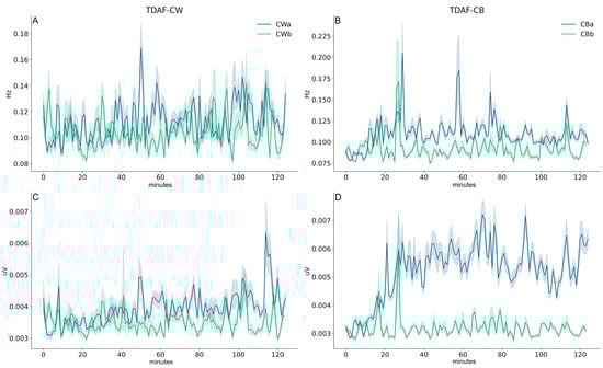 The results based on TDFA (time dispersion analysis of features) were obtained combining the data of all the dodder plants in each treatment, with the lines in Figure 1 representing the median for all the values. Therefore, the time series analysed in this study result from the analysis of the twenty-three individual time series of each plant in the same treatment. The shaded areas demarcate the range between the highest and lowest values obtained. The series shown in Figure 1 and Figure 2 show a general behaviour where, despite the higher dispersion around the median in several moments, overall, the power distribution was mostly uniform.