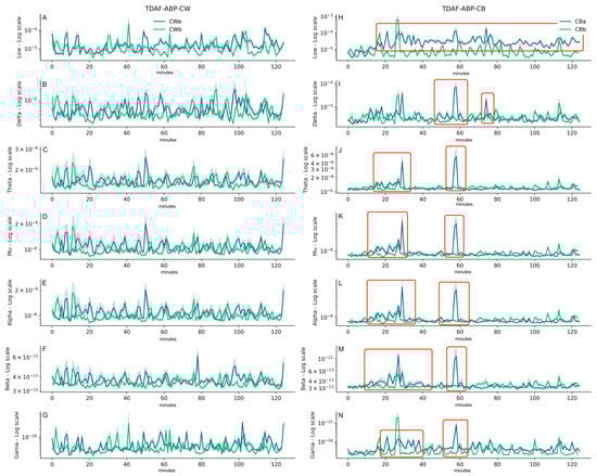 ABP analysis for the electrical signals of the dodders for all the plants studied (n = 23 per treatment). The ranges were named low (0.0–0.5 Hz; (A,H)), delta (0.5–4 Hz; (B,I)), theta (4–8 Hz; (C,J)), mu (9–11 Hz; (D,K)), alpha (8–13 Hz; (E,L)), beta (13–30 Hz; (F,M)), and gamma (20–100 Hz; (G,N)) waves. The Y axis shows the power values returned for each range of frequencies, and the X axis shows the time minute-by-minute during the recordings of the data (2 h before and 2 h after exposure to hosts). The darker lines indicate the median of the data, and the lower and upper limits of the shadow represent the minimal and maximum values obtained, respectively. The green line represents the values of the dodders before being exposed to the host, and the blue line, after the exposure. Relevant changes in the electrome dynamics were highlighted in red.