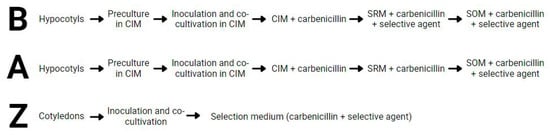 Three A. tumefaciens stable transformation protocols were assayed (Figure 1), two (B and A) based on [24] and one (protocol Z) based on [21]. For all protocols, bacterial inoculums were prepared by centrifuging (5975× g, 10 h, 4 °C) liquid cultures grown at 28 °C in liquid YM medium (Table 3) supplemented with 50 mg/L rifampicin and appropriate bacterial selective agents (Table 4) until reaching an approximate OD600 = 1.0. The bacterial pellets were resuspended in liquid MS medium with 1% sucrose until reaching a OD600 ranging 0.15–0.2, and 100 µM acetosyringone was added. To produce the explant-donor seedlings, B. napus seeds of the DH4079 and DH12075 lines were surface-sterilized for 15 min in a 70% ethanol +0.1% Triton X-100 solution, followed by 15 min in 10% bleach solution and three rinses with distilled water. Seeds were then germinated in Germination Medium (GM; Table 5).