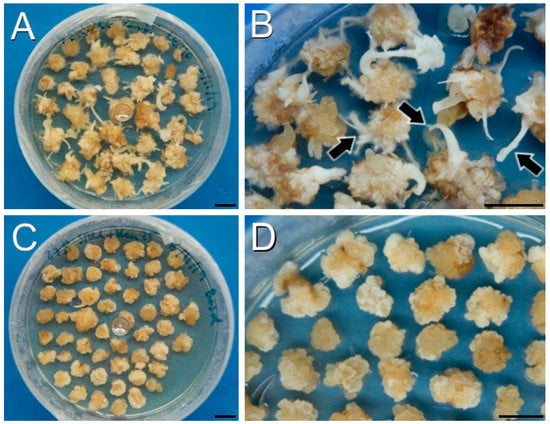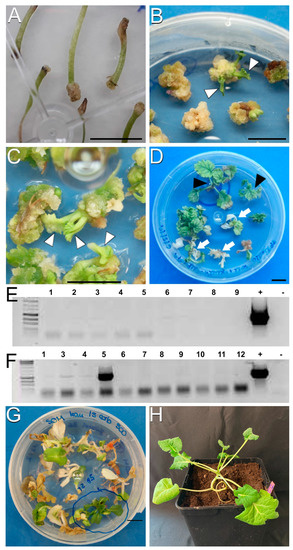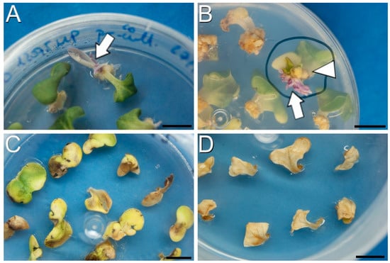 The protocol showing the highest plant-regeneration ratio was protocol A (Table 1 and Table 2), where inoculation consisted of the submersion of hypocotyl explants in the Agrobacterium suspension. With protocol A, calli were produced at the cuttings of hypocotyl explants after two weeks of culture (Figure 4A). Upon individualization of the calli, the first evidence of shoot formation was visible after approximately four weeks of culture (Figure 4B, arrowheads) and after six weeks, clearly visible, well-formed shoots were visible (Figure 4C, arrowheads).