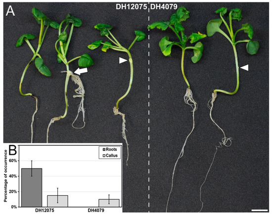 Response of B. napus DH12075 and DH4079 to transient A. rhizogenes infection. (A): The infected DH12075 plants (left) show in some cases no specific response, and in others callus formation (arrowhead) or formation of adventitious roots (arrow). In contrast, DH4079 plants (right) only show either no specific response in some plants or just callus formation (arrowhead) in others. (B): Comparison of the percentages of root and callus formation in DH12075 and DH4079. Bar: 1 cm.