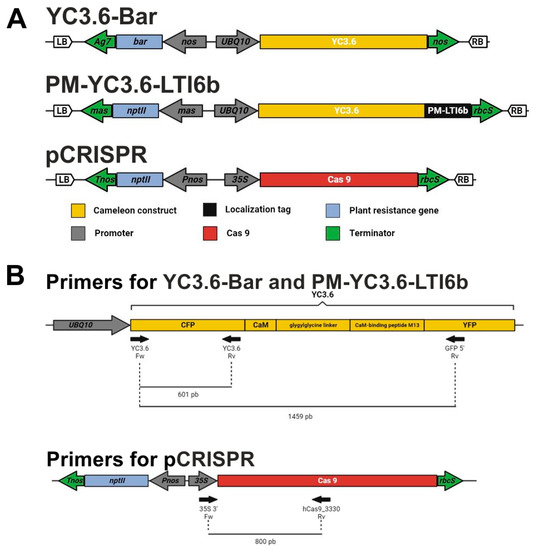 Three plasmids were used in this experiment (Figure 6A). On the one hand, we used YC3.6 and PM-YC3.6-LTI6b, two cameleon calcium sensor constructs that confer BASTA and kanamycin resistance, respectively, kindly provided by Dr. Jörg Kudla [56]. On the other hand, we used pCRISPR, a GoldenBraid-based construction for CRISPR/Cas9 genome editing [57] containing a CaMV 35S promoter, Cas9 CDS, and Nos Terminator cassette, assembled in the pDGB3-alpha1 binary plasmid containing a cassette for kanamycin for plant selection.