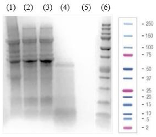 Electrophoretic (SDS-PAGE) analysis of (1) soy protein isolate (PI, 40 µg of protein), (2) lunasin-enriched PI (LPI, 40 µg of protein), and its ultrafiltered fractions ((3) the fraction higher than 10 kDa (LPI-UF1, 40 µg of protein), (4) the 3–10 kDa fraction (LPI-UF2, 40 µg of protein), (5) the fraction lower than 3 kDa (LPI-UF3, 40 µg of protein)) as well as (6) a Precision Plus Protein™ Dual Xtra Prestained Protein Standard.