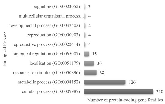 The results of the proteomic analysis of both the PI and LPI samples are shown in Supplementary Tables S1 and S2, respectively. A total of 535 protein sequences were detected in LPI, with an average mass between 9 and 100 kDa (Supplementary Table S2), corresponding to the main proteins present in soybean. Enzyme inhibitors such as the Bowman–Birk protease inhibitor (BBI) and the Kunitz trypsin inhibitor (KTI) were also identified. These inhibitors have been reported to protect the peptide lunasin from the action of digestive enzymes during transit through the gastrointestinal tract [34]. The Panther database was used to classify the identified sequences [35]. In total, 429 protein-coding gene families were associated with annotated biological processes, of which 210 (49.0%) corresponded to proteins participating in cellular processes and 126 sequences corresponded to proteins implicated in metabolic processes (Figure 2). The sequences were also classified according to the cellular components annotated in the mentioned database. It was found that 25.2% (108 sequences) of the classified proteins were related to protein-containing complexes, and 55.9% (240) were related to cellular anatomical entities.