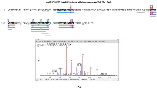 The albumin 2S, in which the peptide lunasin is inserted, was also identified in the proteomic analysis of both PI and LPI (Figure 3), with a higher coverage for LPI than for PI. The fragment 12QLQGVNLTPCEK25 included in the lunasin sequence was detected in PI, while this fragment and the peptide 2WQHQQDS10 were identified in LPI analysis, indicating that an enrichment of lunasin was achieved during the LPI preparation. In Supplementary Figure S1, the area values for the 2S albumin protein peptides in the PI and LPI samples are shown. The area/intensity value was calculated as the total area/intensity of all peptide features matched to the spectra that identified the peptide. In the lunasin region, there was only one peptide common to both samples. The area values for the peptide QLQGVNLTPC(+57.02)EK, identified in the two samples, were 1.26 × 106 (PI) and 4.27 × 106 (LPI). Thus, the estimated ratio was 3.39.