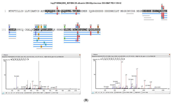 Sequence coverage in (A) soy protein isolate (PI) and (B) lunasin-enriched PI (LPI) for the 2S albumin protein. The spectra of the peptides WQHQQDS and QLQGVNLTPCEK, which correspond to the lunasin region, are shown.