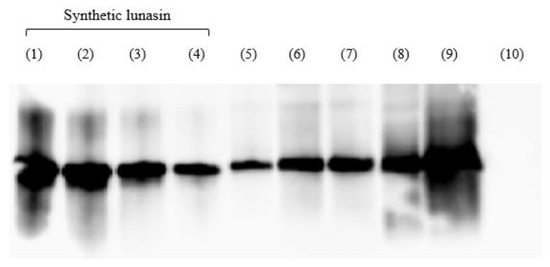 Analysis of soy protein isolate (PI), lunasin-enriched PI (LPI), and its ultrafiltered fractions (LPI-UF1, LPI-UF2, and LPI-UF3) using a Western blot in a PVDF membrane. (1) synthetic lunasin (50 µM), (2) synthetic lunasin (33.33 µM), (3) synthetic lunasin (25 µM), (4) synthetic lunasin (12.5 µM), (5) PI, (6) LPI1 (50 µg of protein), (7) LPI2 (50 µg of protein), (8) LPI-UF1 (50 µg of protein), (9) LPI-UF2 (50 µg of protein), (10) LPI-UF3 (50 µg of protein).