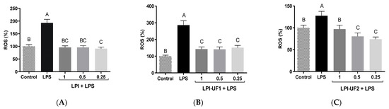Antioxidant effects of lunasin-enriched soybean protein isolate (LPI) and its ultrafiltered fractions in RAW 264.7 macrophages. Effects of LPI on reactive oxygen species (ROS) production (expressed as %) in RAW 264.7 macrophages stimulated with bacterial lipopolysaccharide (LPS, 100 ng/mL) and treated with (A) LPI; (B) ˃10 kDa fraction (LPI-UF1); or (C) 3–10 kDa fraction (LPI-UF2). Different letters indicate significant differences (p ˂ 0.01).