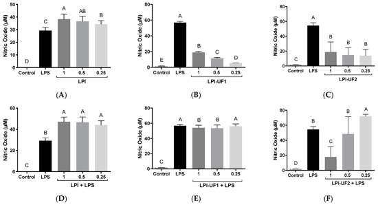 Immunomodulatory effects of lunasin-enriched soybean protein isolate (LPI) and its ultrafiltered fractions on RAW 264.7 macrophages. Effects on nitric oxide (NO, µM) levels in RAW 264.7 macrophages treated with (A,D) LPI; (B,E) ˃10 kDa fraction (LPI-UF1), or (C,F) 3–10 kDa fraction (LPI-UF2) under (A–C) basal or (D–F) lipopolysaccharide (LPS)-challenged conditions (60 ng/mL). Different letters indicate significant differences (p ˂ 0.01).