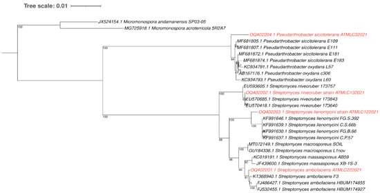 Phylogenetic tree obtained through the neighbor-joining method based on 16S rRNA gene sequence. The confidence value of the node was supported by bootstrap analyses based on 1000 replications and was represented at each node. Bars represent 0.01 substitutions per nucleotide position. The genus Micromonospora was used as an outgroup. The sequences obtained in this study was depicted in red color.