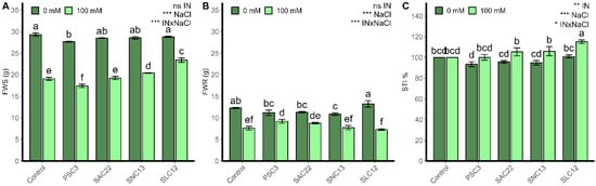 Fresh weight of shoots (FWS) (A), fresh weight of roots (FWR) (B), and salt tolerance index (STI) (C) of lettuce plants non-inoculated (Control) or inoculated with the actinobacteria P. siccitolerans ATMLC32022 (PSC3), S. ambofaciens ATMLC222021 (SAC22), S. niveoruber ATMLC132021 (SNC13), and S. lienomycini ATMLC122021 (SLC12) under salinity stress (100 mM NaCl, light green) and in the absence of salt (0 mM NaCl, dark green). The data include means ± SE (n = 4). The data were analyzed through a two-way ANOVA performed with inoculation and salinity stress as sources of variation. The significant difference was depicted as ns: no significant, p < 0.01: *, p < 0.001: **, and p < 0.0001: ***. Different letters indicate significant differences (p ≤ 0.05) according to Fisher’s multiple range test.