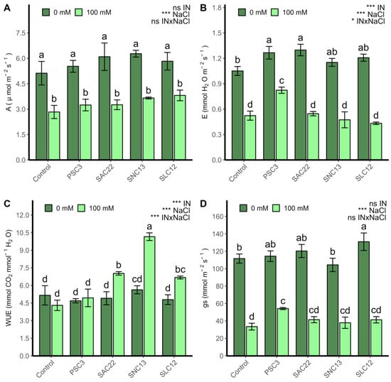 Photosynthesis (A), Transpiration rate (B), water use efficiency (C), and stomatal conductance (gs) (D) of lettuce plants non-inoculated (Control) or inoculated with the actinobacteria P. siccitolerans ATMLC32022 (PSC3), S. ambofaciens ATMLC222021 (SAC22), S. niveoruber ATMLC132021 (SNC13), and S. lienomycini ATMLC122021 (SLC12) under salinity stress (100 mM NaCl, light green) and in the absence of salt (0 mM NaCl, dark green). The data include means ± SE (n = 4). The data were analyzed through a two-way ANOVA performed with inoculation and salinity stress as sources of variation. The significant difference was depicted as ns: no significant, p < 0.01: * and p < 0.0001: ***. Different letters indicate significant differences (p ≤ 0.05) according to Fisher’s multiple range test.