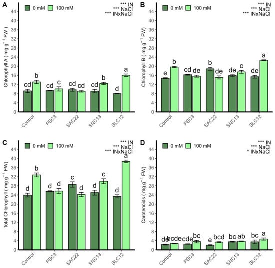 Chlorophyll A (A), chlorophyll B (B), total chlorophyll (C), and carotenoids (D) of lettuce plants non-inoculated (Control) or inoculated with the actinobacteria P. siccitolerans ATMLC32022 (PSC3), S. ambofaciens ATMLC222021 (SAC22), S. niveoruber ATMLC132021 (SNC13), and S. lienomycini ATMLC122021 (SLC12) under salinity stress (100 mM NaCl, light green) and in the absence of salt (0 mM NaCl, dark green). The data include means ± SE (n = 4). The data were analyzed through a two-way ANOVA performed with inoculation and salinity stress as sources of variation. The significant difference was depicted as p < 0.01: * and p < 0.0001: ***. Different letters indicate significant differences (p ≤ 0.05) according to Fisher’s multiple range test.