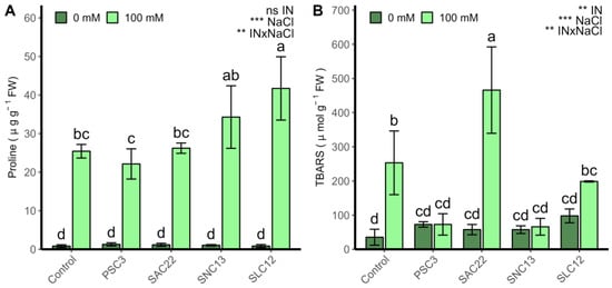 Proline content (A) and TBARS (B) in leaves of lettuce plants non-inoculated (Control) or inoculated with the actinobacteria P. siccitolerans ATMLC32022 (PSC3), S. ambofaciens ATMLC222021 (SAC22), S. niveoruber ATMLC132021 (SNC13), and S. lienomycini ATMLC122021 (SLC12) under salinity stress (100 mM NaCl, light green) and in the absence of salt (0 mM NaCl, dark green). The data include means ± SE (n = 4). The data were analyzed through a two-way ANOVA performed with inoculation and salinity stress as sources of variation. The significant difference was depicted as ns: no significant, p < 0.001: **, and p < 0.0001: ***. Different letters indicate significant differences (p ≤ 0.05) according to Fisher’s multiple range test.
