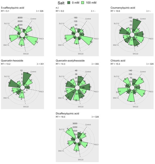 Phenolic compounds identified by HPLC-DAD in lettuce plants non-inoculated (control), inoculated with P. siccitolerans ATMLC32022 (PSC3), S. ambofaciens ATMLC222021 (SAC22), S. niveoruber ATMLC132021 (SNC13), and S. lienomycini ATMLC122021 (SLC12) under salinity stress (100 mM of NaCl in light green) and non-salt stress condition (0 mM of NaCl in dark green). The data include means ± SE (n = 4). The measurement of phenolics is computed and represented in mg g−1 FWR. The retention time (RT) and the wavelength (λ) used to measure the absorbance were also depicted. The data were analyzed through a two-way ANOVA performed with inoculation and salinity stress as sources of variation. Different letters indicate significant differences (p ≤ 0.05) according to Fisher’s multiple range test.