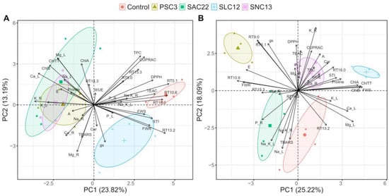 Principal Components Analysis (PCA) biplot for NaCl irrigation of 0 mM and (A) 100 mM of NaCl (B) based on biomass production of shoot (FWS) and root (FWR), photosynthetic parameters: net photosynthesis (A), transpiration rate (E), water use efficiency (WUE), and stomatal conductance (gs), photosynthetic pigments chlorophyll A (ChlA), chlorophyll B (ChlB), total chlorophyll (ChlTT), and carotenoids (Car), total phenolic compounds (TPC), antioxidant activities (AA) determined by DPPH, TEAC, and CUPRAC methods, oxidative damage determined by TBARS, proline content (proline), cations (Na+, Ca2+, Mg2+, and K+), and phosphorus uptake (P) in leaf (L) and root (R) tissues, and phenolic compounds determined by HPLC-DAD and MS/MS (RT5.1, RT9.0, RT10.6, RT13.2, RT14.5, RT15.3, and RT16) of lettuce plants non-inoculated (Control), inoculated by P. siccitolerans ATMLC32022 (PSC3), S. ambofaciens ATMLC222021 (SAC22), S. niveoruber ATMLC132021 (SNC13), and S. lienomycini ATMLC122021 (SLC12).