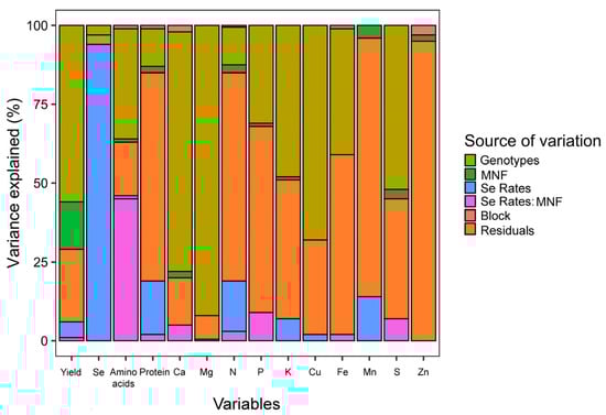 Visual representation of variance components. The colors represent the source of variation (genotypes, MNF, Se rates, block, and residuals). The variation proportion explained by each source of variation for each response variable is observed on the Y-axis (percentage).