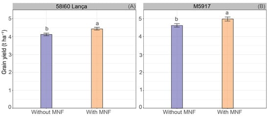 Grain yield (t ha−1) of soybean plants of genotypes 58I60 Lança (A) and M5917 (B). Lowercase letters compare the application of Se associated or not with MNF, at the 5% significance level, according to Tukey’s test. Vertical bars refer to the standard error (n = 16).