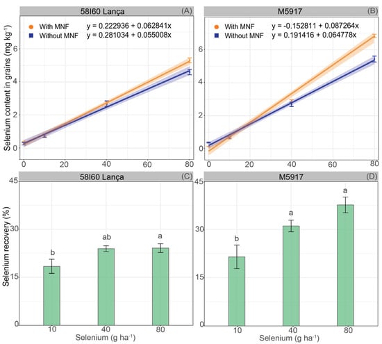 Foliar spraying with Se resulted in a linear increase of the Se content in soybean grains (Figure 3A,B). Similar results were observed in wheat [15] and rice [24]. The lowest rate at which it is possible to see a difference in Se content among the treatments (with MNF and without MNF) is 43.8 kg Se ha−1 for Lança and 29.4 kg Se ha−1 for genotype M5917, which is about 33% less, indicating that the application is more efficient for the last genotype. This also demonstrates that the interaction of Se foliar and other nutrients can enhance the uptake/redistribution of Se in plants.
