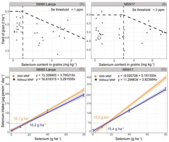 Figure 4C,D show the relationship between Se rate and human daily Se intake based on an average recommended intake of soybean protein (25 g person−1 day−1). As per the estimated daily Se intakes shown in Figure 4C,D, the rate of Se that should be supplied to the plant in order to obtain a Se content in soybean grains suitable for human consumption (considering a recommended daily intake of 70 μ of Se day−1) would be: 15.1 g Se ha−1 (with MNF—genotype 58I60 Lança), 16.2 g Se ha−1 (without MNF—genotype 58I60 Lança), 15.3 g Se ha−1 (with MNF—genotype M5917), and 15.4 g Se ha−1 (without MNF—genotype M5917).