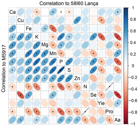 Pearson’s correlation matrix among the variables at 58I60 Lança and M5917 genotypes. Yie = yield; Pro = protein; Aa = amino acids. * means a positive Pearson’s correlation.