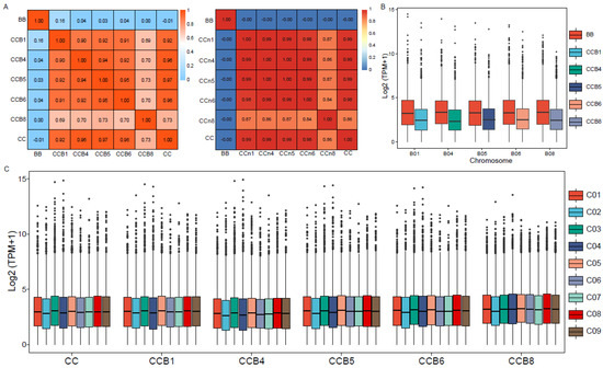 The differential impacts of different additional chromosomes on gene expression in the C-genome were also reflected by a hierarchical analysis of the similarities in terms of overall expression patterns. The differences of a global average of all gene expressions showed that CCB8 MAAL was more divergent in the overall expression patterns than the rest. Furthermore, the special MAAL was clustered together in an independent group, and the results in derived B. oleracea (non-MAALs) are shown in Figure 1A. Box plots of all expressed gene profiles (TPM > 1) on the donor B-subgenome, in all of the pairwise comparisons, showed that the gene expressions in the single B-subgenome chromosome were lower than that in natural B. nigra, confirming that the haploidy could be susceptibly disturbed in gene expression by its own change (Figure 1B). Other than for the recipient C-subgenome, due to the integrality of euploid, the box plots of all expressed gene profiles (TPM > 1) presented only subtle differences in different chromosomes (Figure 1C).