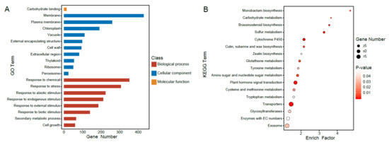 All proteins in the B. oleracea genome and the B. nigra genome were aligned to TAIR10 (Arabidopsis thaliana) (https://www.arabidopsis.org/, accessed on 19 July 2022) proteins to identified homologous genes by BLASTP (v2.10.0) [61] with an E-value threshold of 10−5. The GO annotations of each gene in B. oleracea genome and B. nigra genome were corresponded to homologous genes in A. thaliana and the KEGG annotation of each gene used online KEGG database (https://www.genome.jp/kegg/, accessed on 19 July 2022). The GO and KEGG enrichment analysis used TBtools (v1.0987663) [62] software and ggplot2 (v3.3.6) package for plotting.