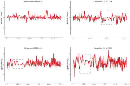 Dysregulated domains of gene expression in different chromosomes in some pairwise comparisons. Red lines denote the smoothed distribution for the differentially expressed genes in these selected chromosomes, as representatives, using the Lowess function of R. Dysregulated domains that are exhibited in dotted boxes are clearly observed in only three chromosomes in three pairwise comparisons (chromosome C02 in CCB4, chromosome C08 in CCB6, and chromosome C08 in CCB8). The y axis represents the log2(fold change) value of TPM between the MAALs and CC. The x axis represents the sorted positions of genes on these chromosomes.