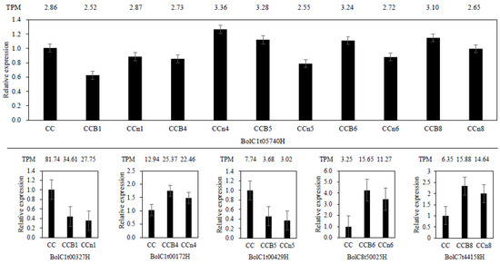 To validate the transcriptome data, we selected five DEGs that were prepared for qRT-PCR assays (Figure 5). One of them (BolC1t05740H) expressed in all materials associated with B. oleracea (the parent, all MAALs and all non-MAALs), the rest of them were distributed to each group (BolC1t00327H in group CCB1 and CCn1, BolC1t00172H in group CCB4 and CCn4, BolC1t00429H in group CCB5 and CCn5, BolC8t50025H in group CCB6 and CCn6, BolC7t44158H in group CCB8 and CCn8). All these results showed similar expression patterns to those determined by transcriptome. Taken together, these results were consistent with transcriptome analysis, suggesting that the transcriptome results were reliable.