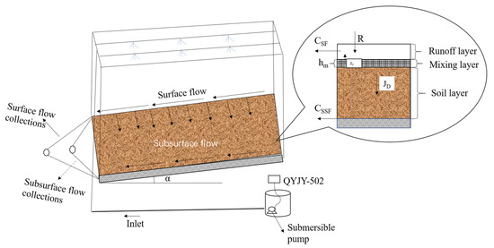Schematic diagram of experimental structure. Note: R is rainfall intensity, mm/h; CSF is concentration of solute in surface flow, mg/L; CSSF is concentration of solute in subsurface flow, mg/L; hm is effective mixing depth, cm; JU and JD are upward and downward solute flux from soil layer, respectively, mg/cm·min; α is depth gradient, (°).