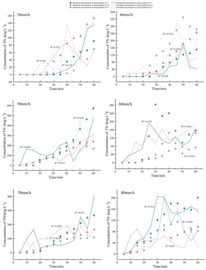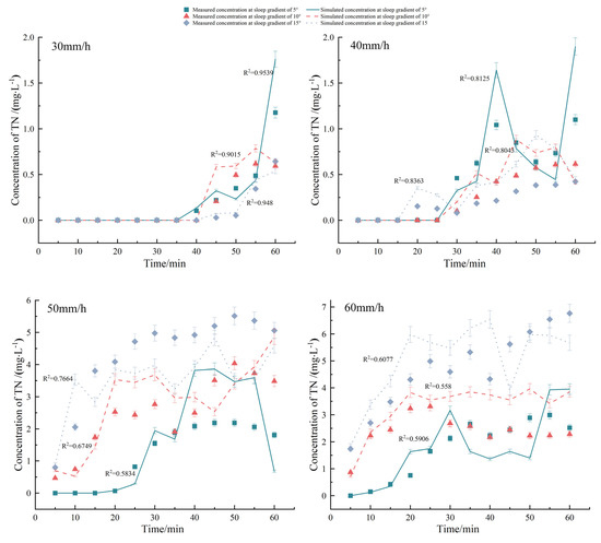 Figure 2 shows that the TN concentration that migrated with SF under different rainfall intensities and slope gradients exponentially increased with time, along with a sharp increase at the initial stage of runoff generation, followed by stabilization later. When rainfall intensity was ≤40 mm/h, the TN concentration in SF decreased with the increasing slope gradient, which was mainly due to the small rainfall intensity and insufficient erosion force on the soil, thereby resulting in TN being slowly dissolved and released. Additionally, although the increase in SF enhanced the erosion force, it also led to shorter contact between SF and the soil. Although this did not increase the TN concentration, it instead slowly declined. However, when the rainfall intensity was set to >40 mm/h, the TN concentration in SF increased with the increasing slope gradient. This was mainly because TN was adsorbed on the surface of soil particles during the early stage of SF and with the passage of rainfall time, SF gradually increased and fully interacted with the soil, thereby increasing the TN loss. Then, with the TN loss from the surface soil, the TN content in SF gradually decreased and finally steadied with the SF stability. Furthermore, at the same slope gradient, the rainfall intensity was larger and the TN concentration was higher in SF. The reason is that the soil moisture content at the initial stage of rainfall was low, which caused greater rainwater absorption by the surface soil, thereby generating a small SF. As the surface soil moisture content became saturated, SF gradually increased, generating larger soil erosion intensity and ultimately higher TN loss.