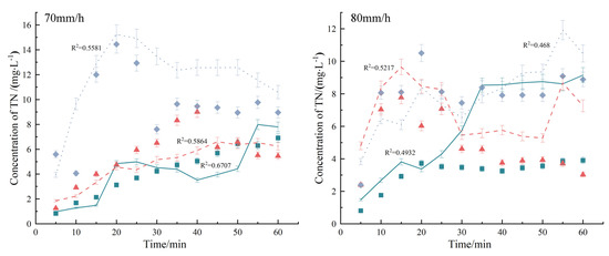 As compared with the process of TN loss carried by SF, those with SSF varied significantly between repeated treatments, with no uniform law being observed with the changes in the rainfall intensity and slope gradient, owing to the complexity of the SSF production process and the uncertainty of rainfall infiltration and migration in sloping farmland [37,38]. In this test, an increasing trend of the TN concentration in the SSF under different treatments was presented, which indicated that TN was lost from the soil with water accumulation and migration. On one hand, the solubility and extremely strong mobility of N played a role in it [39], while on the other hand, rainfall had gradually infiltrated into the soil to leach the TN, which ultimately resulted in the gradually increased TN concentration in the underground flow. Although the numerical simulation of the process of TN loss carried by the SSF was simulated by the traditional convection-dispersion equation used to study solute transport and was solved via the HYDRUS-2D software, the simulation results were poor when compared with those about the surface, which was related to the errors between the simulated and measured data. Moreover, some parameters, such as the molecular diffusion coefficient could not be measured in the simulation, as it required backward deduction of the simulation results to obtain appropriate parameter values [40,41]. Therefore, the basic loss law could only be revealed by the simulation results.
