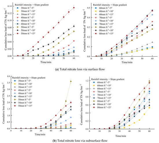 At a rainfall intensity of 30–80 mm/h, TN was mainly lost through the SSF. However, with the increasing rainfall intensity, the proportion of TN loss loading through SF rose from 14.03% to 35.82% (i.e., with the rising rainfall intensity, N was more likely to be lost through SF). However, there was no uniform law for the impact of slope gradients on TN loss.