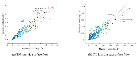Scatter diagram of simulated and measured TN loss concentrations. (a). TN loss via surface flow (b). TN loss via subsurface flow.
